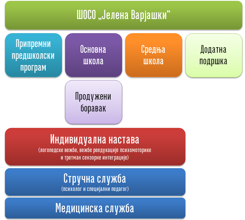 Наша школа континуирано развија и проширује своје делатности, због чега је данас сложена установа која обухвата више сегмената рада. Пружамо едукацију, рехабилитацију и свеобухватну подршку деци и ученицима са сметњама у развоју и инвелидитетом, од предшколског до средњошколског узраста.