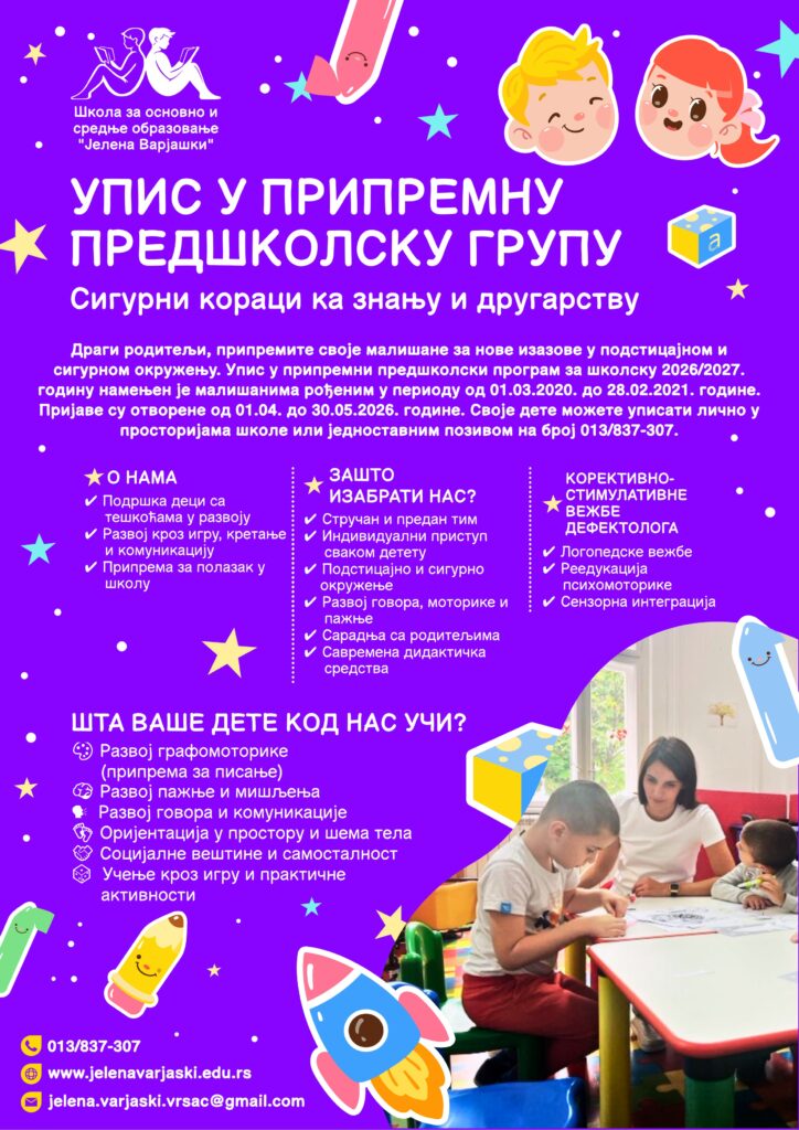 Драги родитељи, припремите своје малишане за нове изазове у подстицајном и сигурном окружењу. Упис у припремни предшколски програм за школску 2026/2027. годину намењен је малишанима рођеним у периоду од 01.03.2020. до 28.02.2021. године. Пријаве су отворене од 01.04. до 30.05.2026. године. Своје дете можете уписати лично у просторијама школе или једноставним позивом на број 013/837-307.