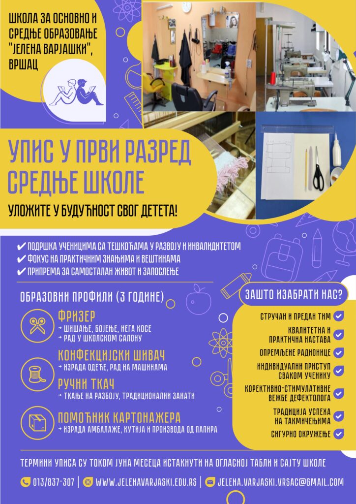 Драги родитељи, упис у нашу установу спроводи се у складу са важећим законским прописима, уз сталну и отворену сарадњу са породицом и пуно уважавање индивидуалних потреба и могућности сваког детета, како бисмо заједно пронашли најбољи пут за његов даљи развој. Тачни термини уписа у средњу школу се објављују током јуна месеца. Можете их пратити на нашој огласној табли у школи или овде, на званичном сајту.