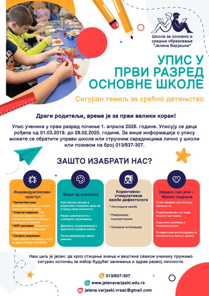 Драги родитељи, време је за први велики корак. Упис ученика у први разред почиње 1. априла 2026. године. Уписују се деца рођена од 01.03.2019. до 28.02.2020. године. За више информација о упису можете се обратити управи школе или стручним сарадницима лично у школи или позивом на број 013/837-307.