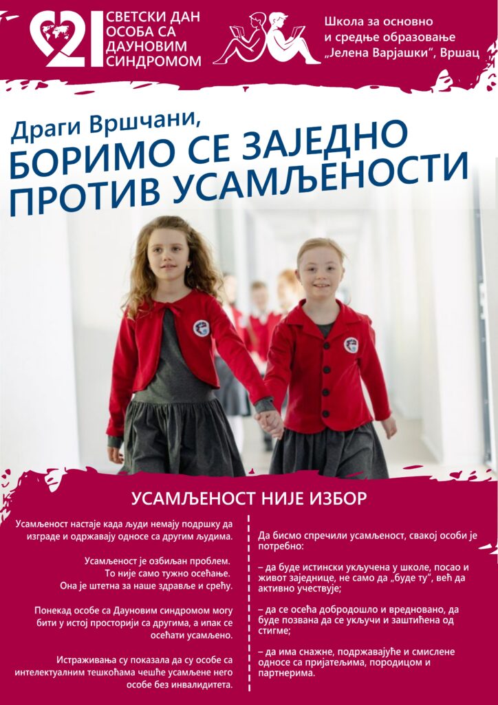 Поводом обележавања Светског дана особа са Дауновим синдромом, ове године посебан акценат ставља се на важну тему – „Заједно против усамљености“. Ова порука позива све нас да се замислимо над тим колико је осећај припадања важан за сваког човека и како можемо допринети да нико не буде изостављен.